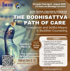 The Institute for Buddhist Counseling & Chaplaincy (IBCC), affiliated with the International Network of Engaged Buddhists (INEB), is happy to announce “The Bodhisattva Path of Care: Compassion and Skillful Means in Buddhist Counseling,” an online training & mentorship program for mental health counselors and other caregivers who support those experiencing distress and trauma.