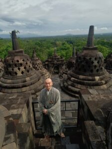 The workshop and week’s worth of activities came to a fitting conclusion with a morning pilgrimage to the great 9th century Mahayana/Vajrayana ruin of Borobudur, the largest Buddhist temple in the world and, along with Bagan and Angkor Wat, one of the great archeological sites of Southeast Asia. Hendrick Tanuwidjaja, author of the Indonesian language Soul of Borobudur: The Philosophy of Cakravartin’s Mandala, was the perfect person to lead the group through the vast grounds, all the way through the fantastic stone reliefs of the lower levels of the monument, and finally to the “purified” top level of stupas and Buddha images, signifying the formless realms of enlightened mind. From this level, participants got panoramic views of the multiple volcanos in the environs, which buried the monument for centuries under the ash of their explosions. Everyone felt the deep mystery of this sacred environment, which is known as the Kedu Plain, a sacred place for Javanese due to its agricultural fertility. As part of the closing ceremony that was held here, a group of participants took formal refuge in the Three Jewels of Buddha, Dharma, and Sangha and also received dharma names created by Rev. Nemoto.