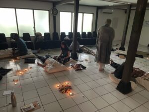 This is only the second time this workshop has been done outside of Japan, the first being in Thailand in March of 2025. Rev. Nemoto has commented both times about how fascinating it is to learn the inner life, especially through the vision boards, and the ways of confronting death of non-Japanese peoples. It has been a new window for him to understand human life. Nida Shaikh, in observing the workshop, also commented with fascination at the way participants experienced their final moments through the way they held their feet, some still filled with tension expressing a life of continual perseverance. During the Vision Board reflections in the evening, many of these emotions came to life through stories of those who have experienced devastating war in their countries. One participant also was a cancer survivor, and she gave a deeply moving presentation on how Rev. Nemoto’s death scenario mirrored her actual experience and her gratitude at having returned from the precipice of death. While this specific workshop was a very adventurous activity to begin the three-day program, it also created a deep bond among the participants as well as a heightened perspective for the work to come in the following days.