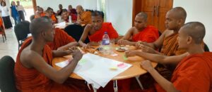 A second contemporary application of classic Buddhist teachings in this workshop was the use of the Four Noble Truths for social analysis and action planning. With the mornings devoted to studying issues in chaplaincy and counseling, the afternoons were spent workshopping on social contexts in which each of the participants are living. As mentioned above, chaplaincy involves social ethics and extending one’s service towards engagement in dysfunctional social systems that form deeper causes of individual suffering. Starting from the 1st Noble Truth of dukkha, expressed again in English awkwardly and incompletely as “suffering” (the “what”), participants attempted to identify the main expressions or manifestations of dukkha in their communities, especially from the standpoints of mental health and inter-relational issues. Common themes emerged as suicide and drug addiction, especially among the young; the crumbling of family systems with domestic violence and adultery being commonplace; and an overall level of high stress as the pace of life has become overwhelming as Sri Lankans chase the dream of “more” through overwork and overconsumption.