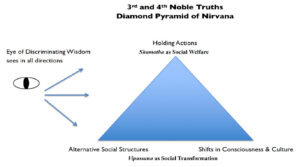 Building on this work, participants in the second afternoon worked on creative solutions through the 3rd and 4th Noble Truths re-envisioned through Joanna Macy’s Three Dimensions of the Great Turning: 1) Holding Actions, emergency short-term actions to address the critical suffering witnessed in the 1st Noble Truth, 2) Transforming the Foundations of our Common Life or Alternative Social Structures, and 3) Shifts in Perception and Values/Consciousness and Culture. It should be noted that Macy, herself, was strongly influenced by the Sarvodaya movement, where she worked for a year studying Buddhist community organizing. Again, as a way to contextualize and communicate these ideas within Buddhist, and especially Theravada, teachings, Holding Actions were explained as a kind of social shamatha meditation practice. Shamatha is “calming” meditation, which allows the energetic system to regulate so that the deeper work of vipassana or “insight” can take place, rooting out the deeper causes of dukkha. Holding Actions are, thus, various kinds of emergency work to help those in suffering—such as, telephone hotlines for the suicidal, soup kitchens for the homeless, protests to prevent the re-start of nuclear reactors—which “hold” the damage being done at bay but do not root out the core causes of social injustice. The other two dimensions are the work of social vipassana, such as creating new value systems not based in greed-anger-delusion (such as in consumer capitalism) but rather based in sharing (dana), contentment (santutthi), sympathetic joy (muditha). The structures that emerge out of this culture empower individual citizens to act with critical insight and agency while building a collective (sangha) that balances the middle way between selfish individualism and mindless collectivism.